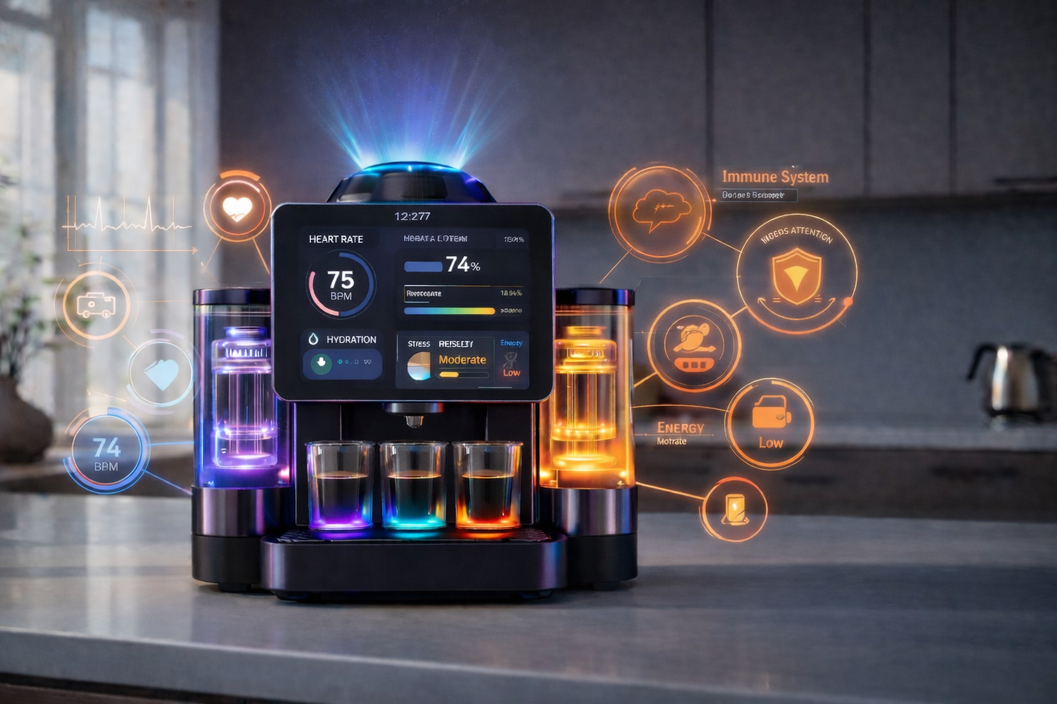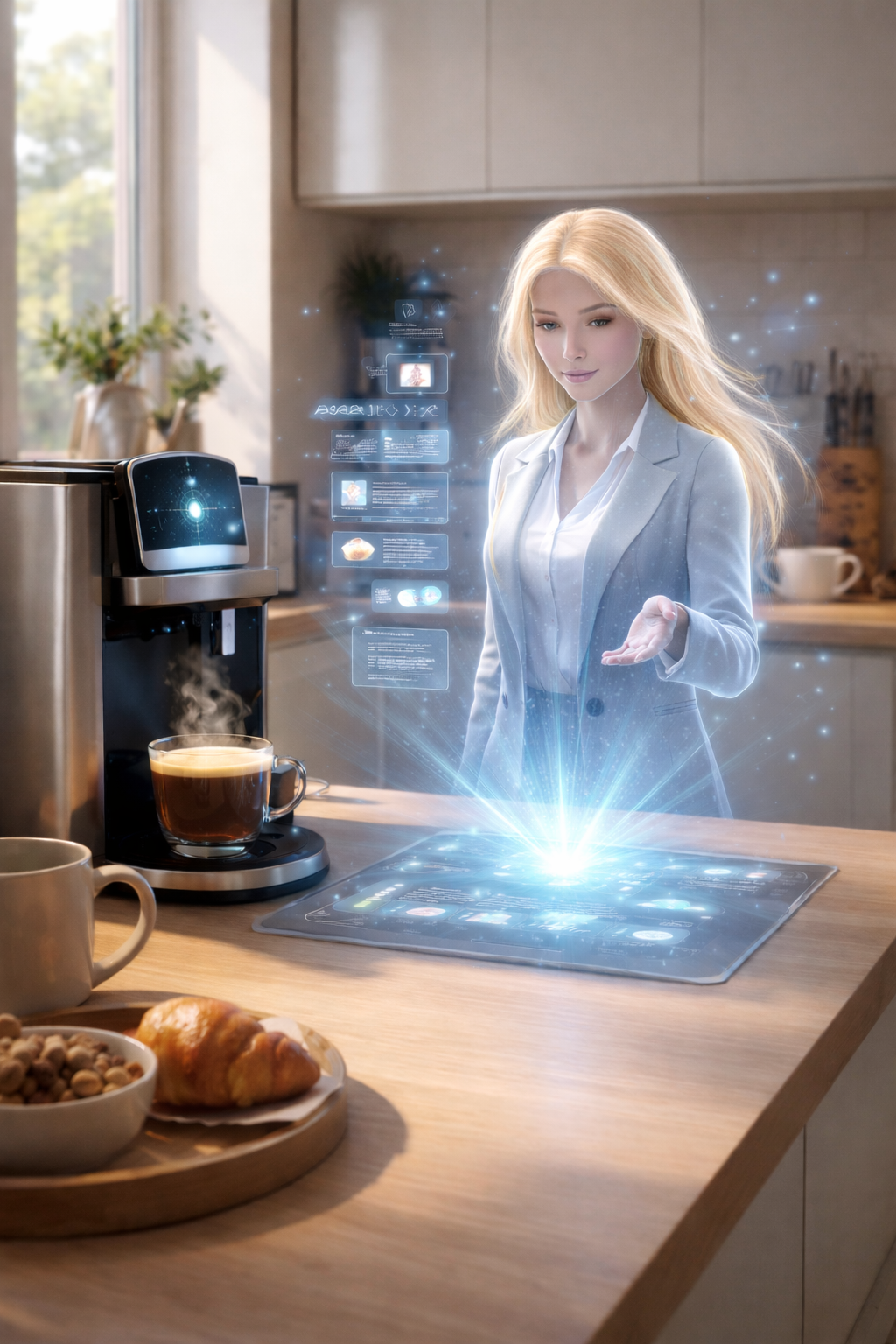 HoloQuantum Projection™ transforms your countertop into a futuristic experience — a lifelike hologram that interacts, guides, and evolves with you.